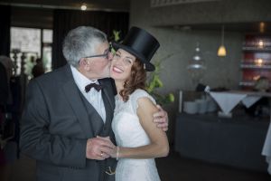 Brautgrossvater gratuliert der Braut mit einem kuss auf die Wange